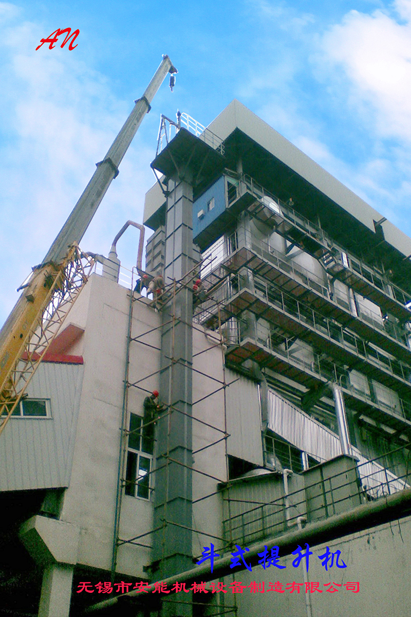 物料经设备进料口均匀的导入安装固定在作连续封闭运行的提升链上的料斗,将物料从机尾进料口处提升至机头出料口处排出,实现单点进料、单点重力式或混合式卸料。