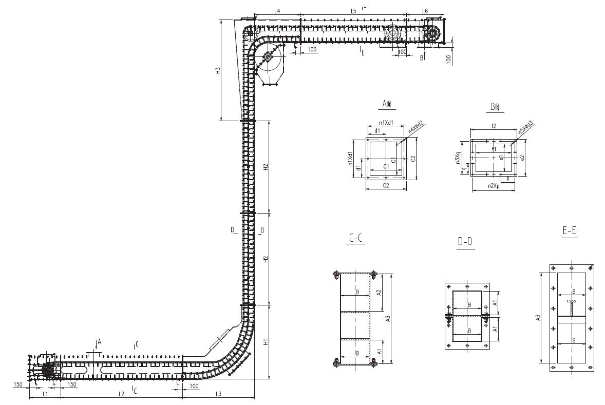 MZ系列刮板输送机由机头部件、中间槽体、弯曲槽体、机尾部件、刮板输送链、驱动装置等组成。全封闭机壳,设备运行时无物料外泄,设备的进出料口及输送长度可根据工艺要求灵活设计布置。物料经设备进料口均匀的进入槽体底部,由从机尾向机头方向作封闭连续运行的承载刮板输送链将物料从进料口处连续均匀的输送至岀料口排出。可实现多点进料、多点卸料。机尾设置丝杆调节装置来调节输送链的松紧度,保证其在运行中始终保持适度张紧状态,使设备处于稳定的运行状态。